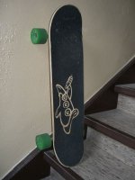 Damir Rasic steht auf den Brettern, die die Welt bedeuten. Die Idee hinter dem Beitrag: Die weiche Einstellung seines selbstmontierten Boards "Purpur" ermöglicht ihm zwar das Fahren enger Kurven in der Fußgängerzone, beeinträchtigt die Fahrbarkeit dabei jedoch hin zu bockigem - um nicht zu sagen BÖSEM Verhalten! Vor diesem Hintergrund war die Motivwahl für den LucasArts-Fan keine harte Wahl. Einige Stunden, wunde Finger, abgebrochene Teppichmesser und erstumpfte Scheren später war die Sache dann geritzt.